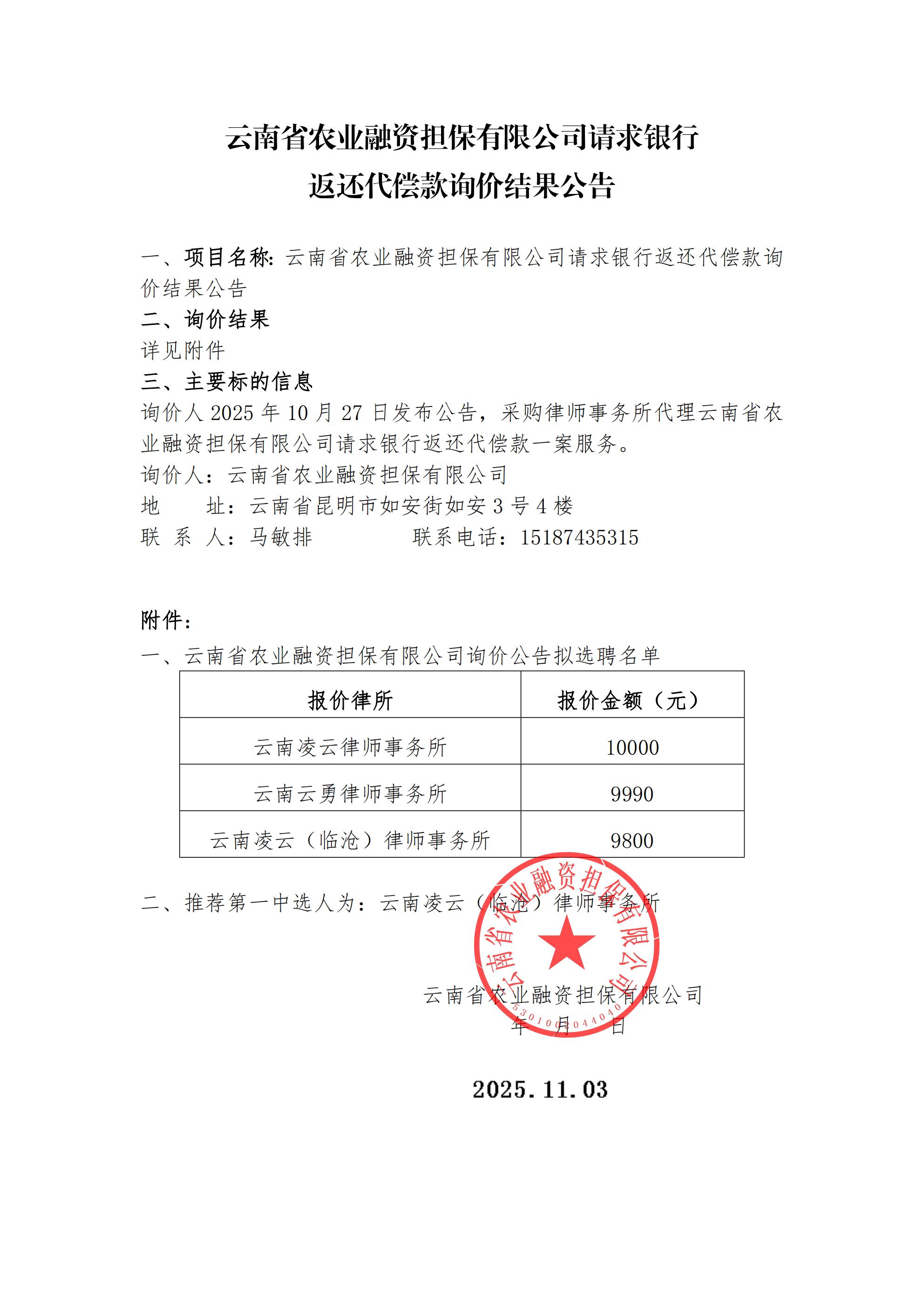 云南省農(nóng)業(yè)融資擔保有限公司請求銀行返還代償款詢價結(jié)果公告